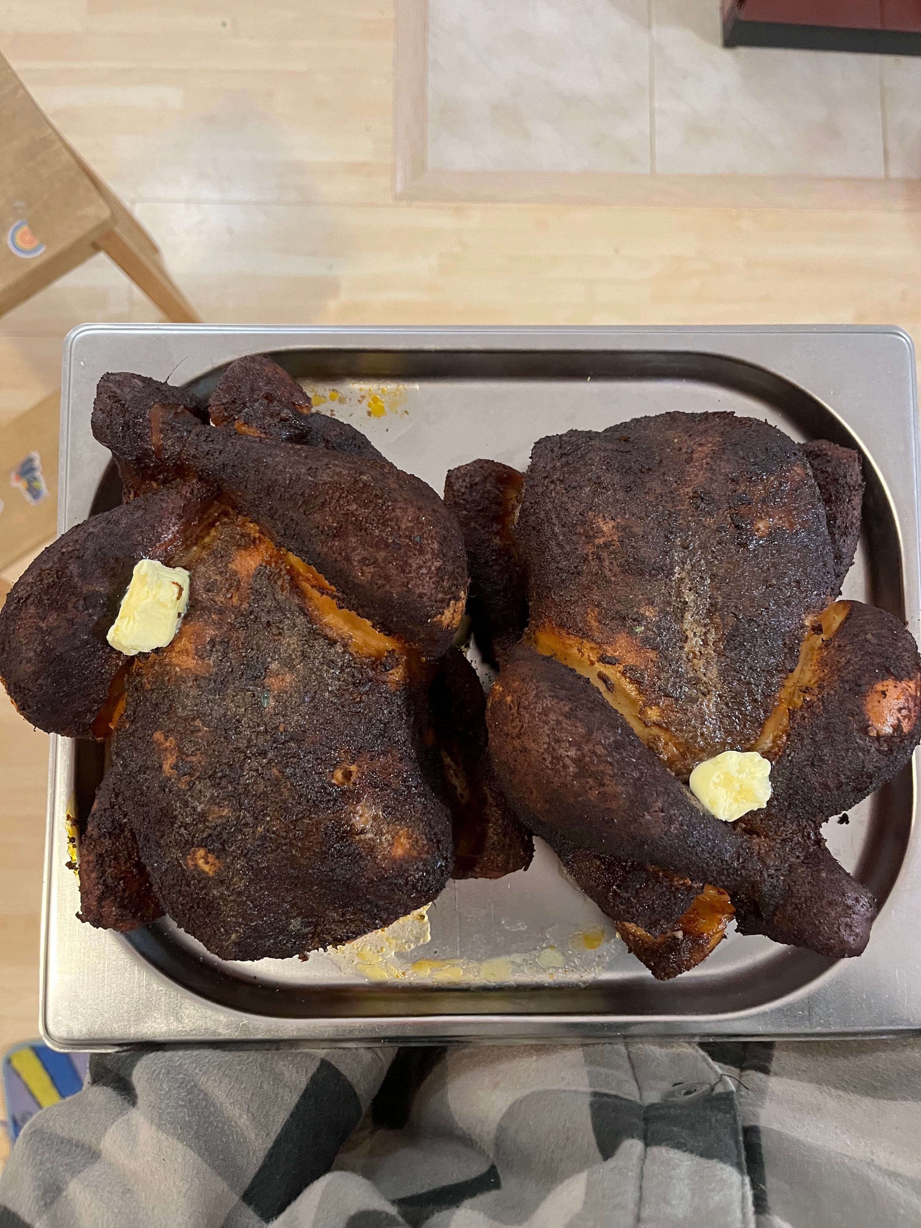 A ještě jedna důležitá věc - na kuřátka jsem v průběhu pečení pokládal plátky másla. Ne moc, ale udělal jsem to asi pětkrát. Údajně to pomáhá proti vysušení.