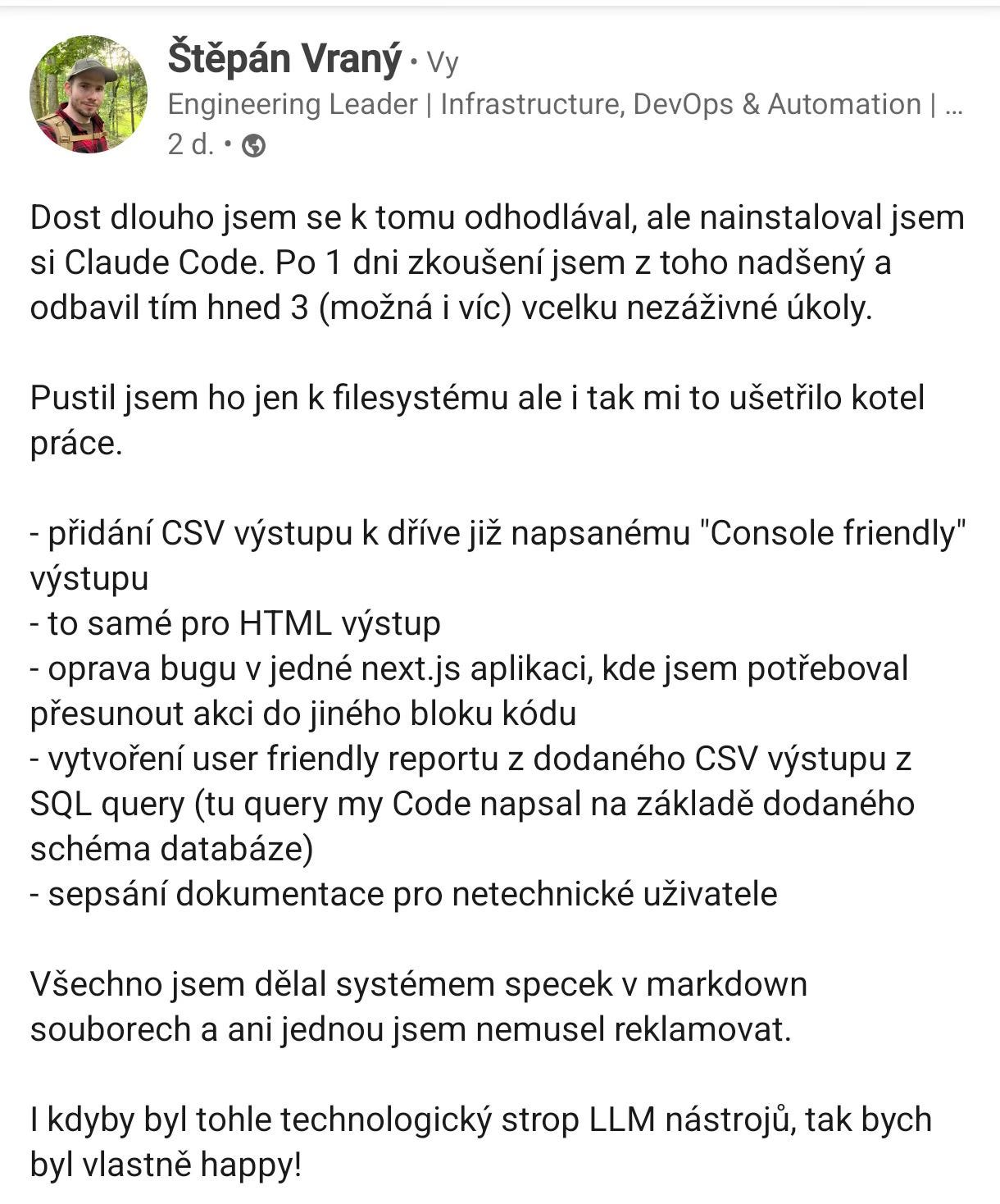 Na LI už moc nepíšu. A snažím se oddělovat pracovní věci od těch, co dělám tady. Ale tenhle popis běžné středy v práci v sobě nese zásadní sdělení. AGI je sice daleko a my ho pravděpodobně nikdy nespatříme, ale paradigma práce vývojářů se už delší dobou mění i s nástroji, kterým osobně AI neříkám.